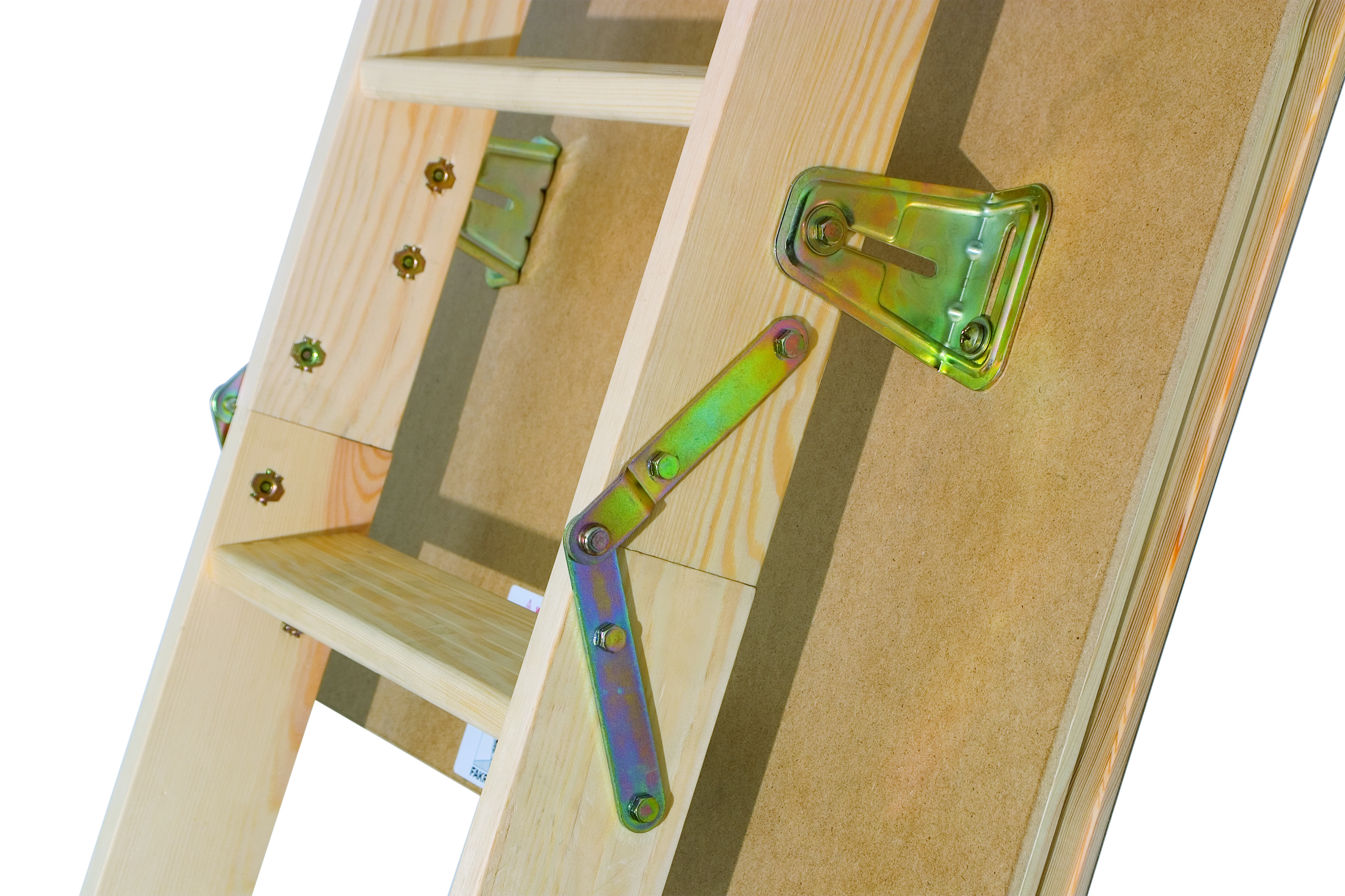 Деревянная чердачная лестница LWS изготовлена из древесины сосны и укомплектована утепленной крышкой, облицованной ДВП бежевого цвета (толщина крышки люка с утеплителем – 36 мм). Крышка люка крепится металлическими шарнирами, которые позволяют регулировать длину лестницы (макс. 40 мм). Для транспортировки лестница снижается в пазах, перед использованием необходимо отодвинуть лестничный марш от плиты люка.