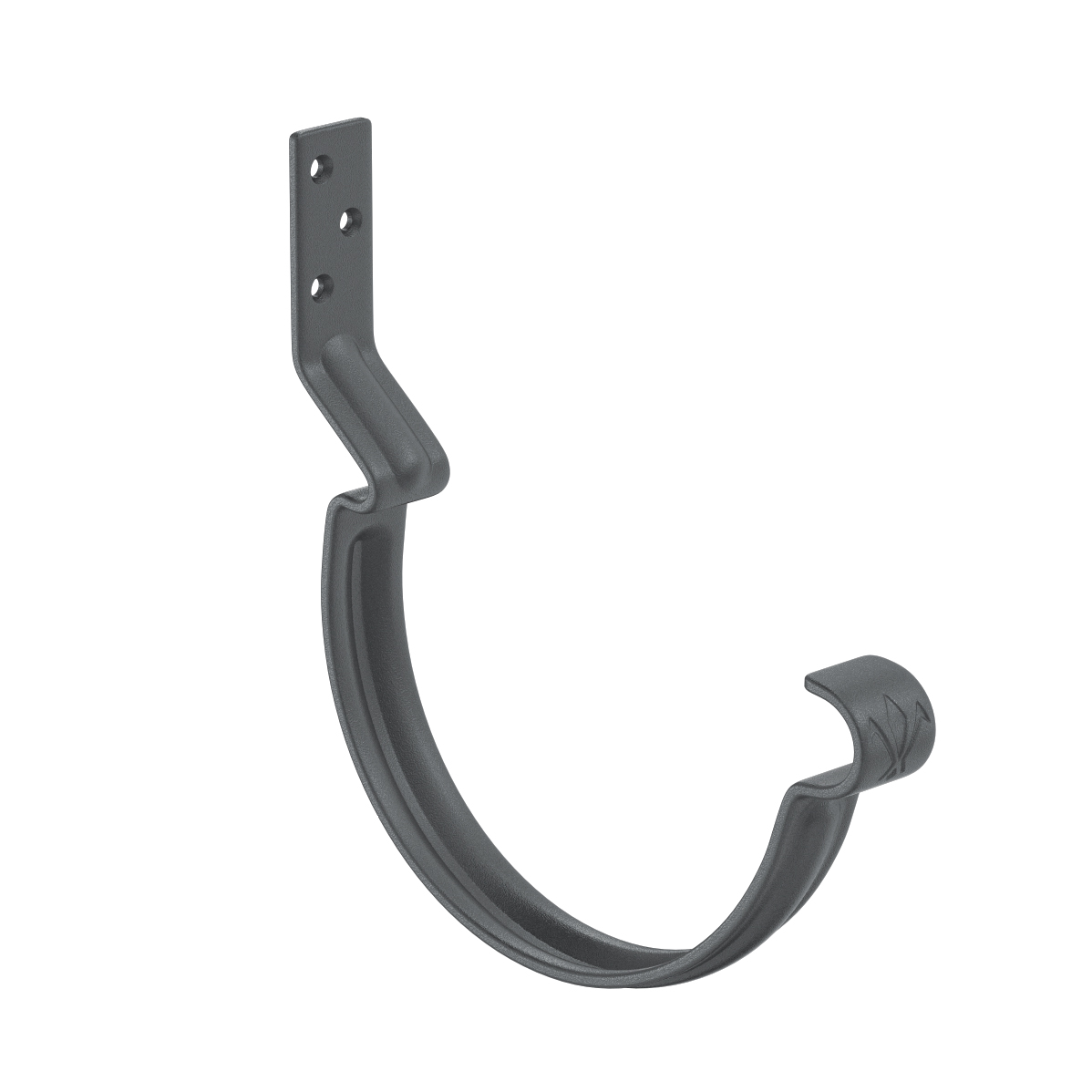 Конструкция крюка имеет более вытянутое и глубокое ребро жесткости, поэтому крюк выдерживает повышенные силовые нагрузки. Передний замок крюка фиксирует завиток желоба снаружи, и благодаря этому желоб удобно монтировать даже после установки фартука-капельника. Задний замок имеет конструкцию, исключающую смещение желоба под нагрузкой. Отверстия под крепеж выполнены с зенковкой под шляпку в потай. На передней части крюка расположен фирменный штамп - лилия.