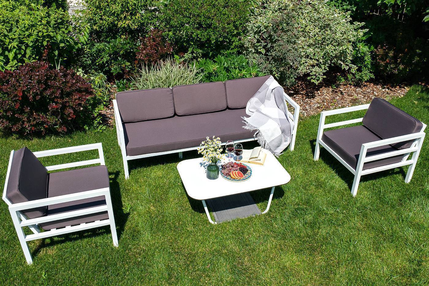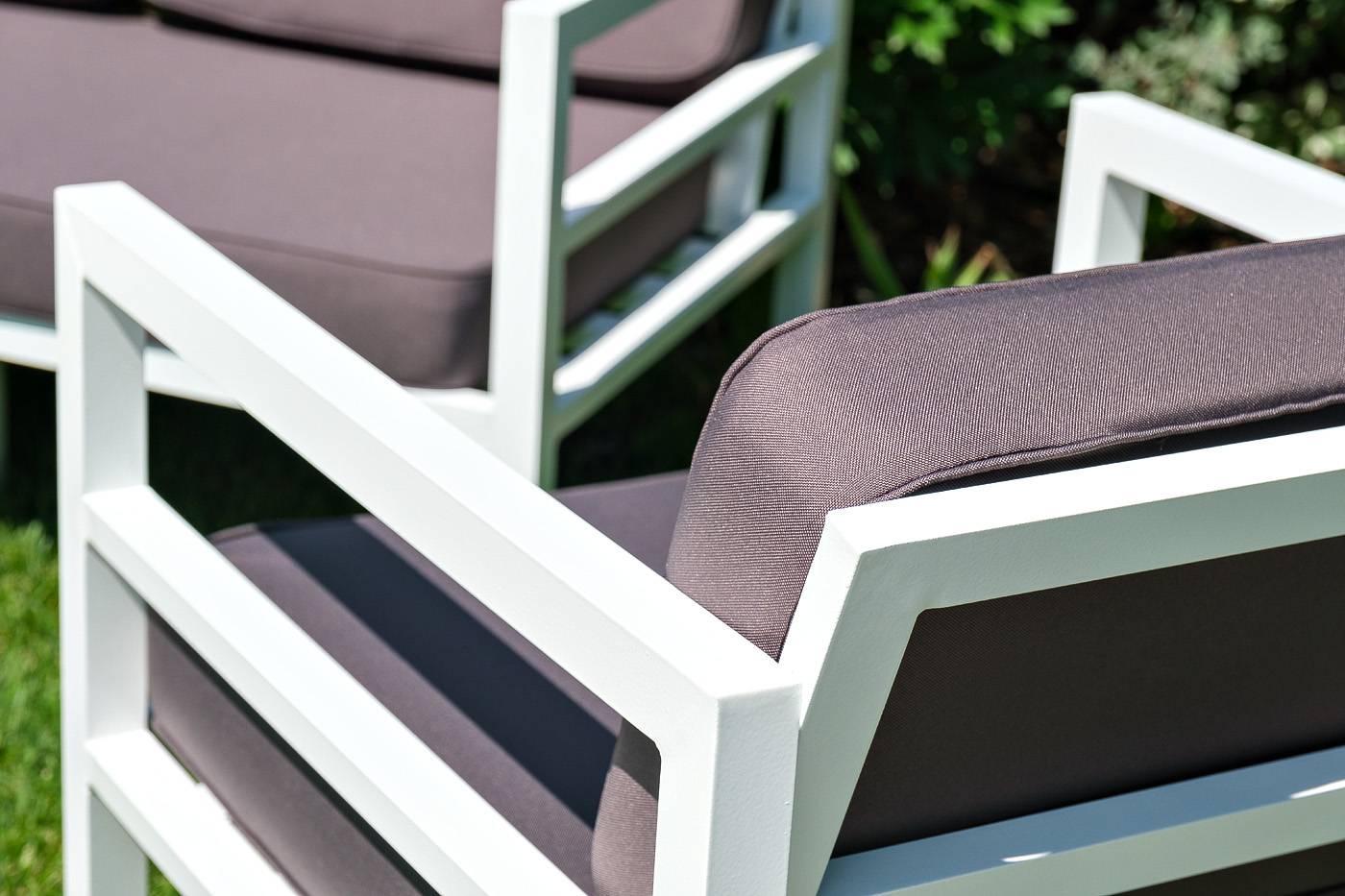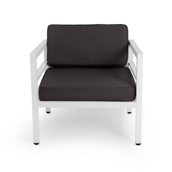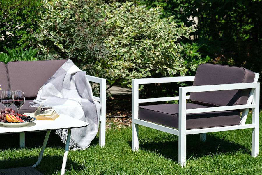 В комплекте на сидениях и спинке предусмотрены подушки контрастного темно-серого оттенка со съёмными чехлами. Строгое лаконичное кресло подходит для использования на открытом воздухе и в помещении, в том числе и в зоне повышенной влажности.