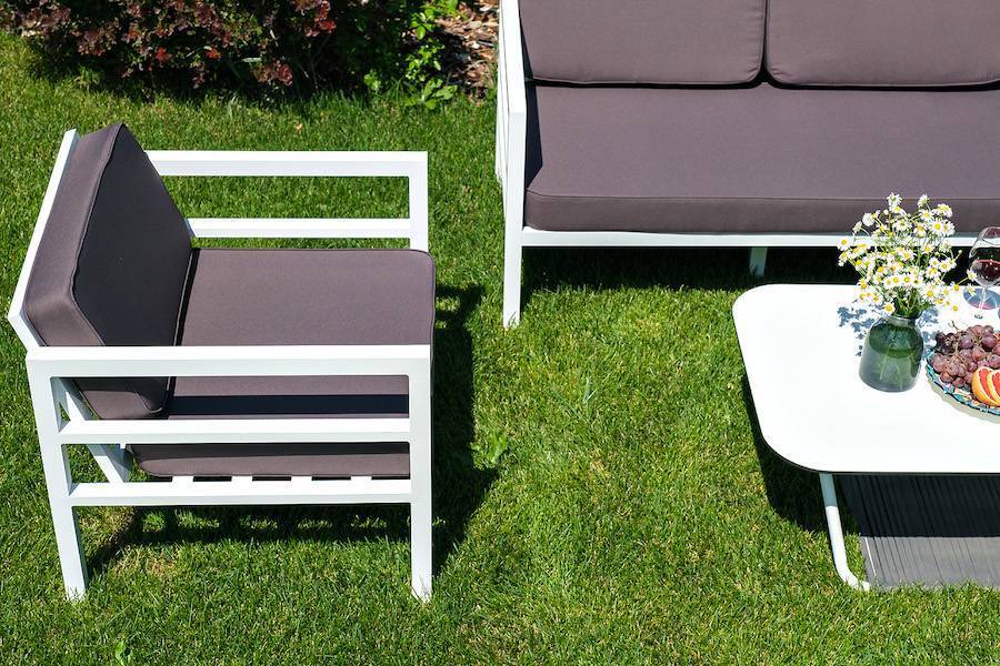 Металлическое садовое кресло в минималистическом стиле «Эстелья». Каркас выполнен из легкого прочного алюминия, который окрашен порошковой высокостойкой краской белого цвета.