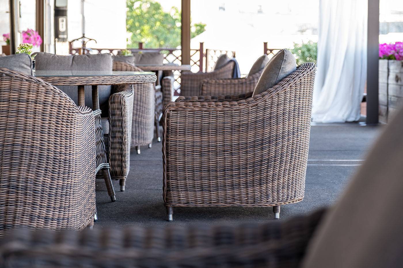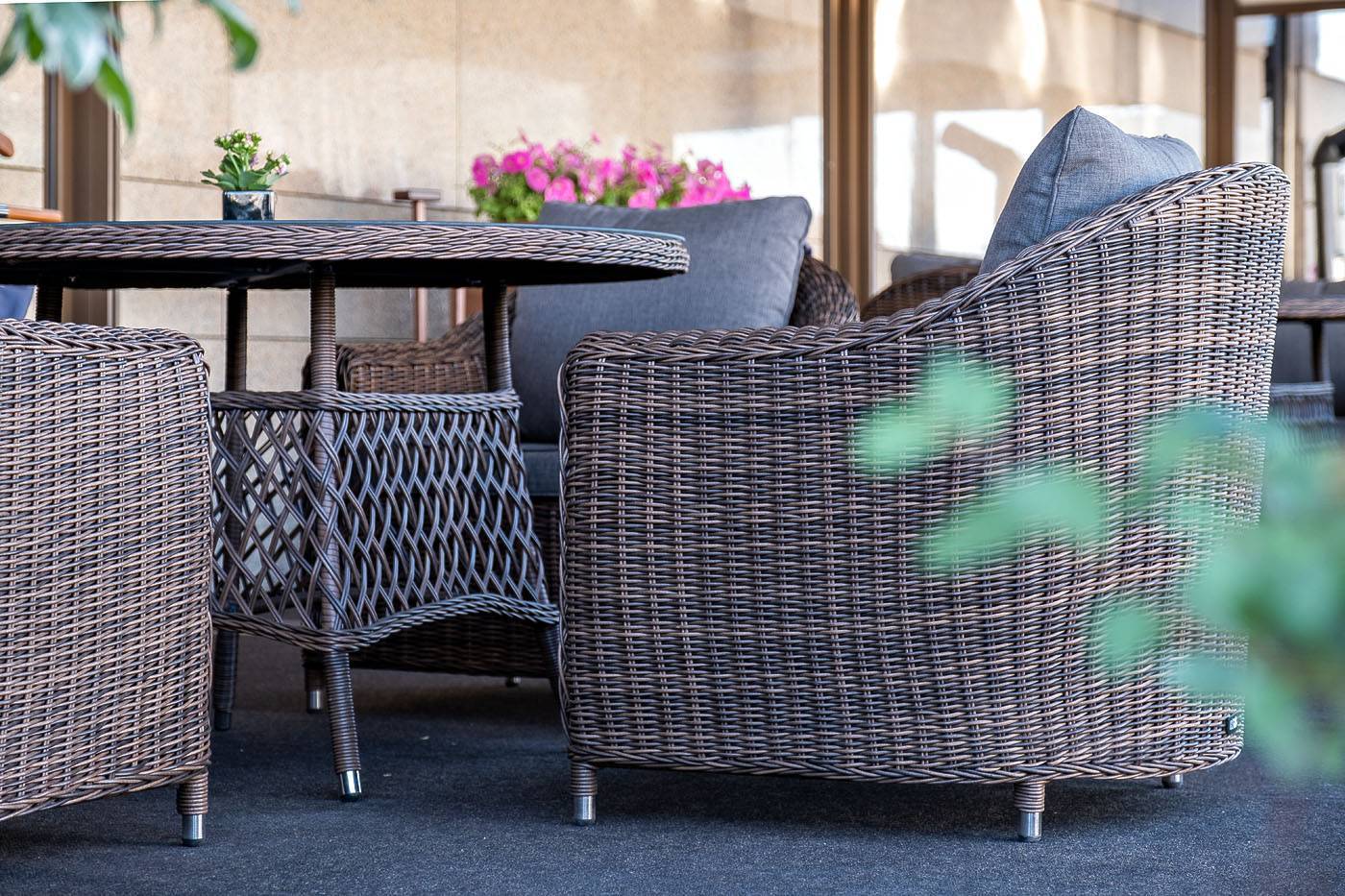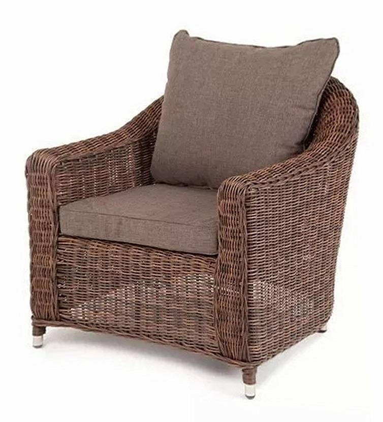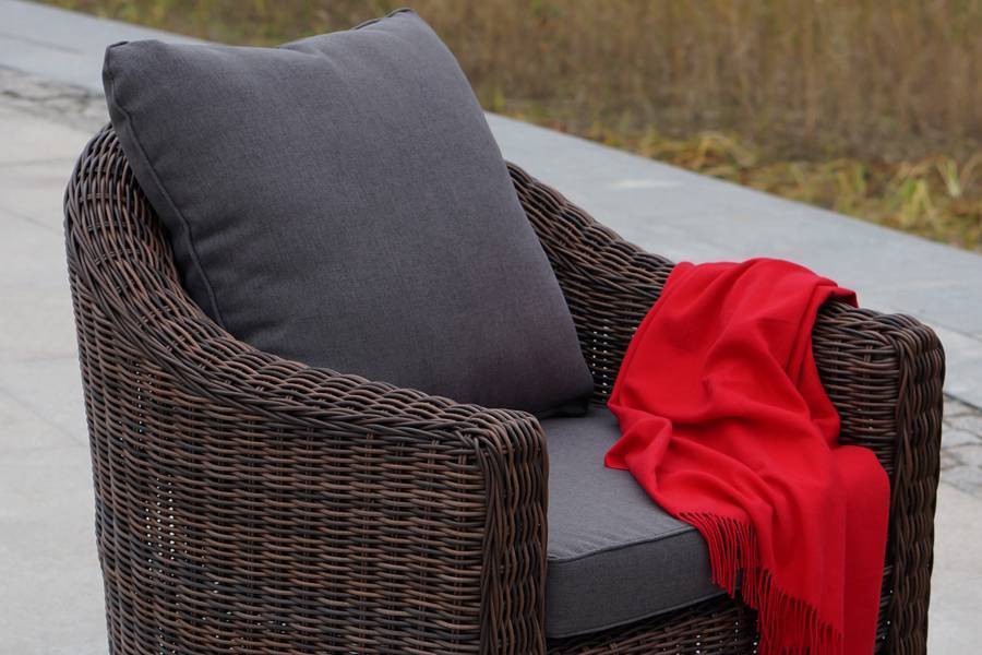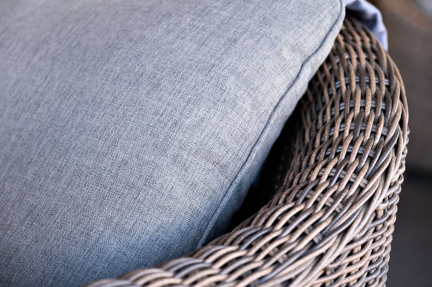 У кресла есть мягкие подушки, выполненые в серо-коричневом цвете. Они сделаны из прочного полиэстера с плотностью 230гр/м2. Ткань имеет влагоотталкивающую пропитку, которая защищает ее от сильного намокания.