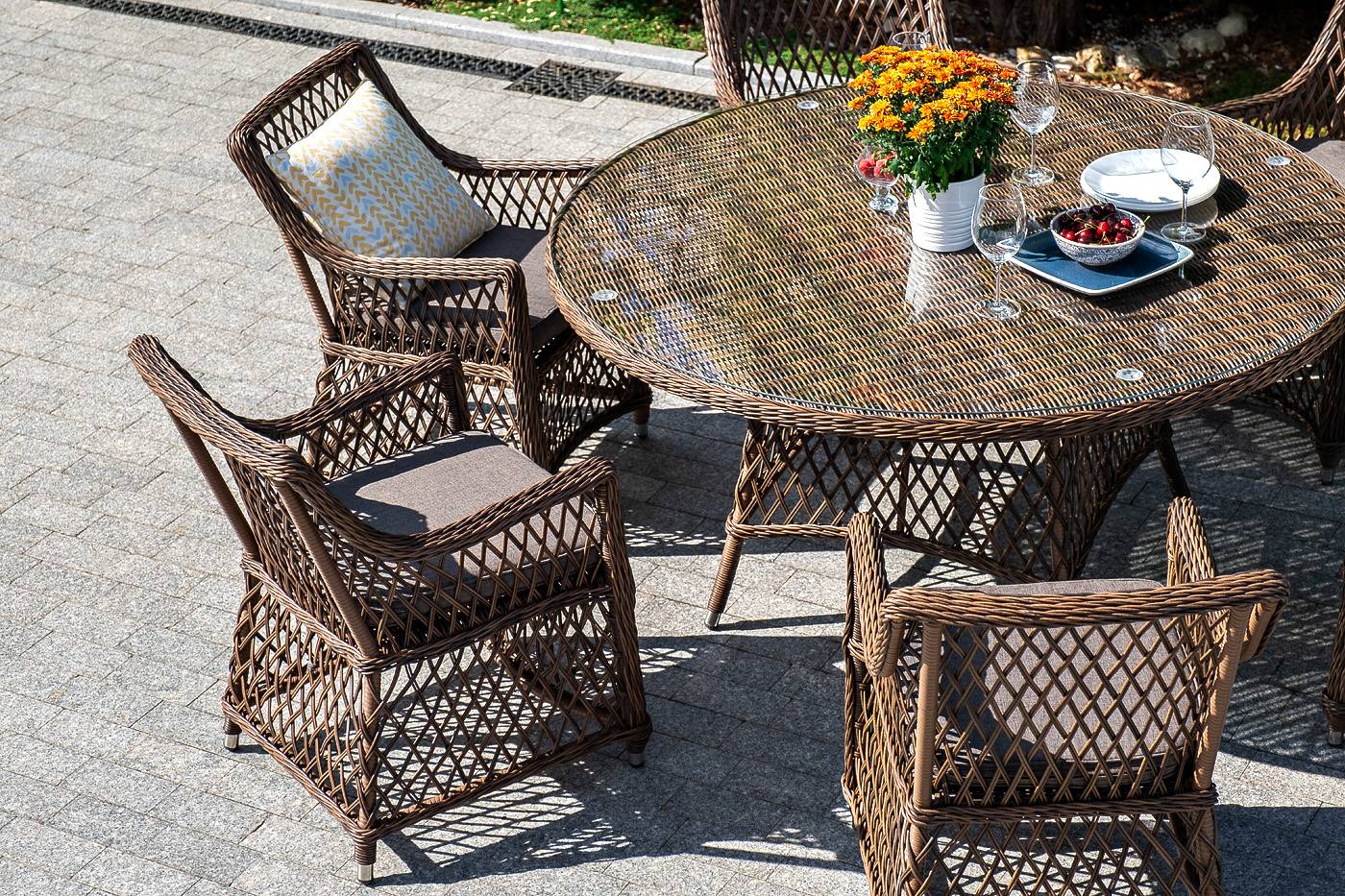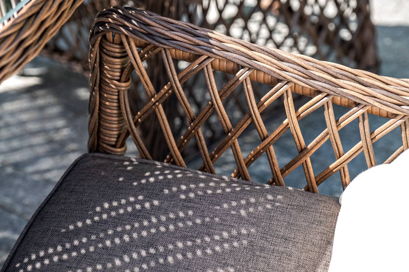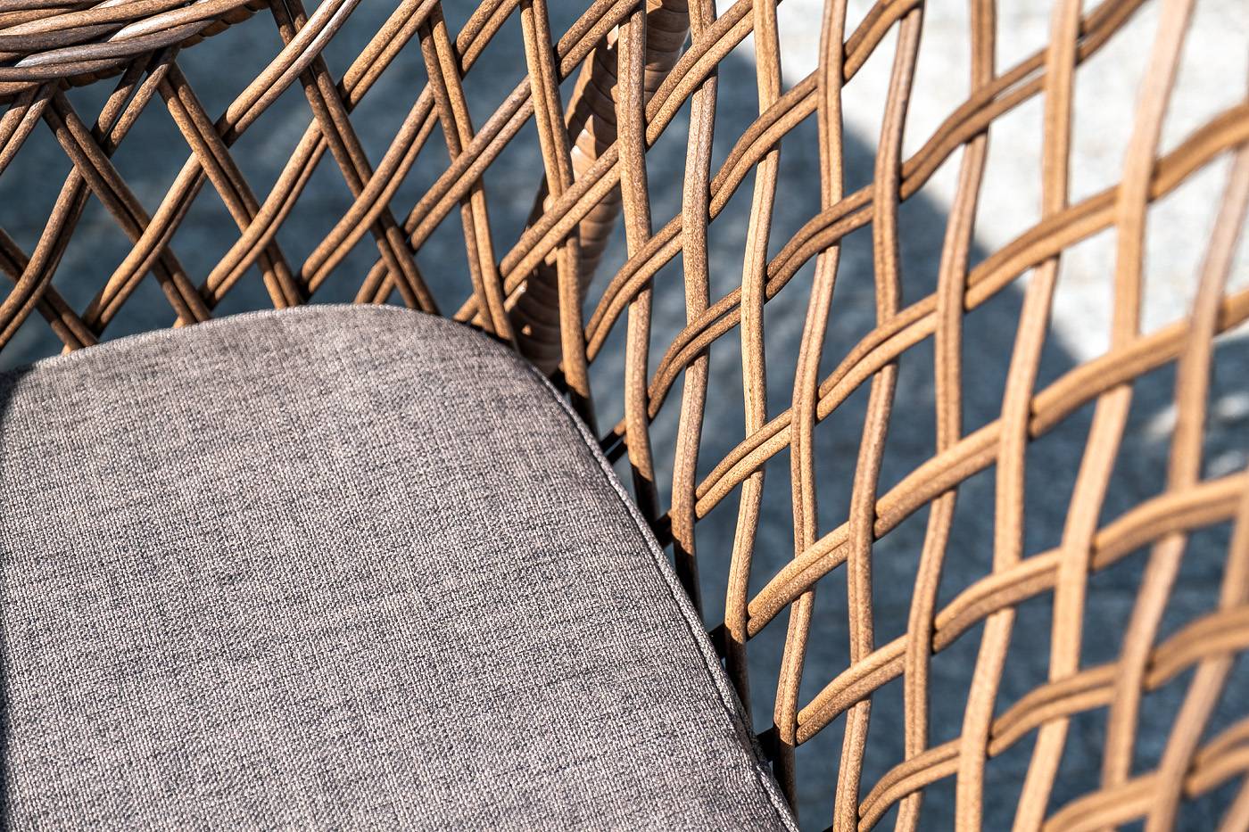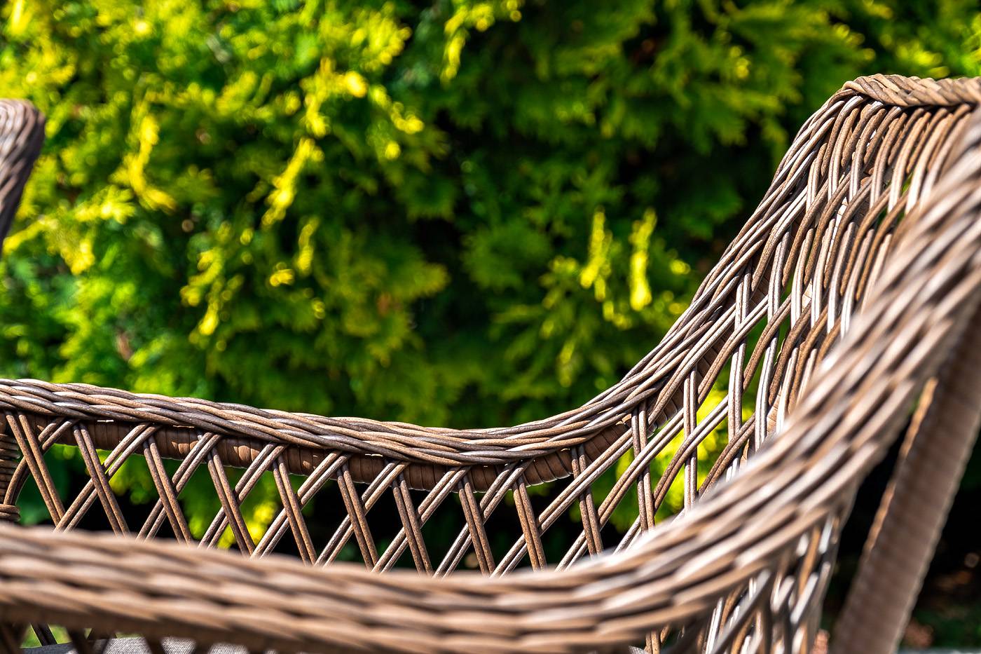 Кресло из искусственного ротанга «Латте» отлично подходит для зоны отдыха на открытом пространстве.