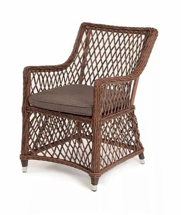 Каркас сделан из прочного алюминия. Сверху конструкции - ручное плетение из круглого искусственного ротанга. Стул коричневого цвета.