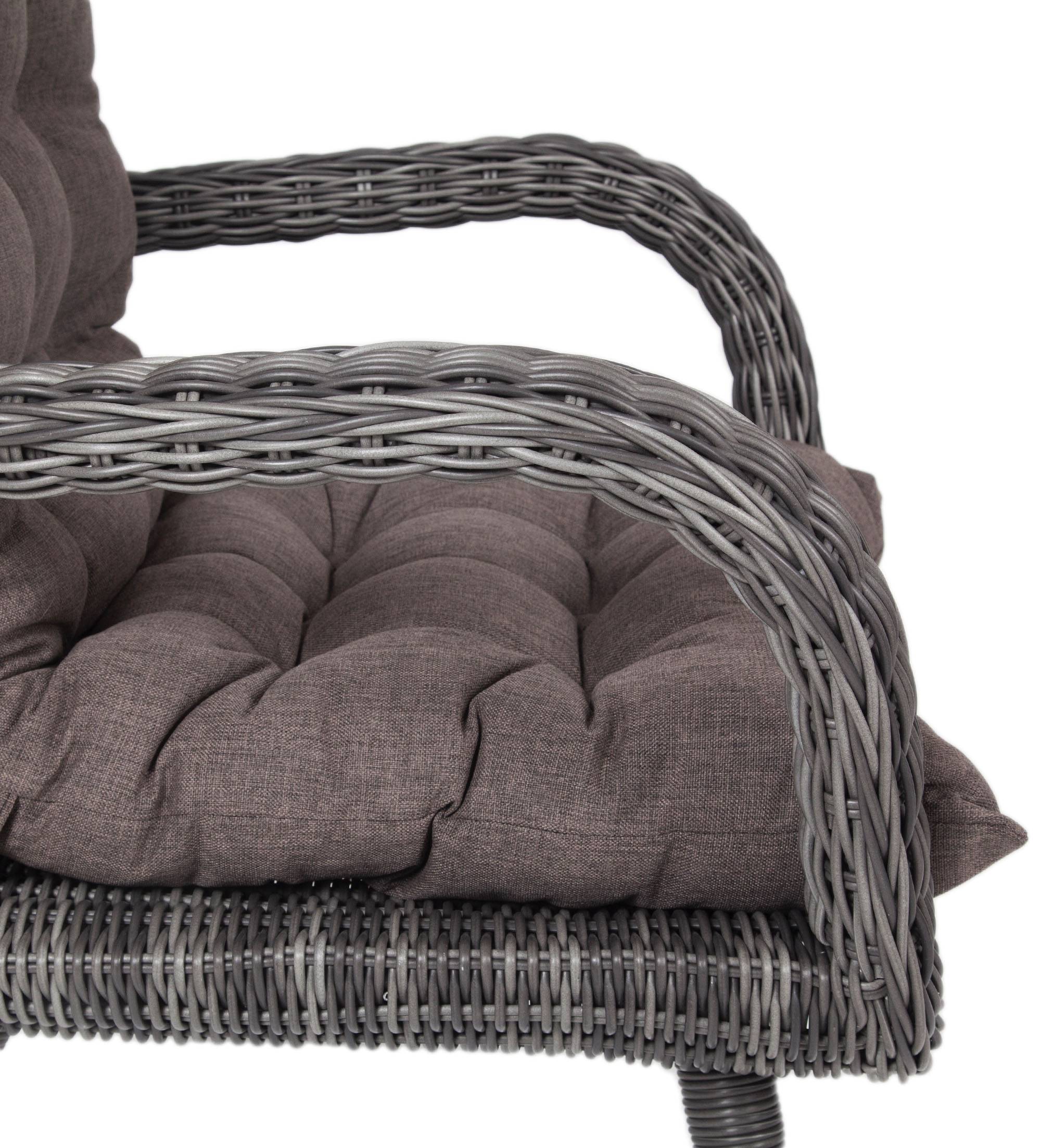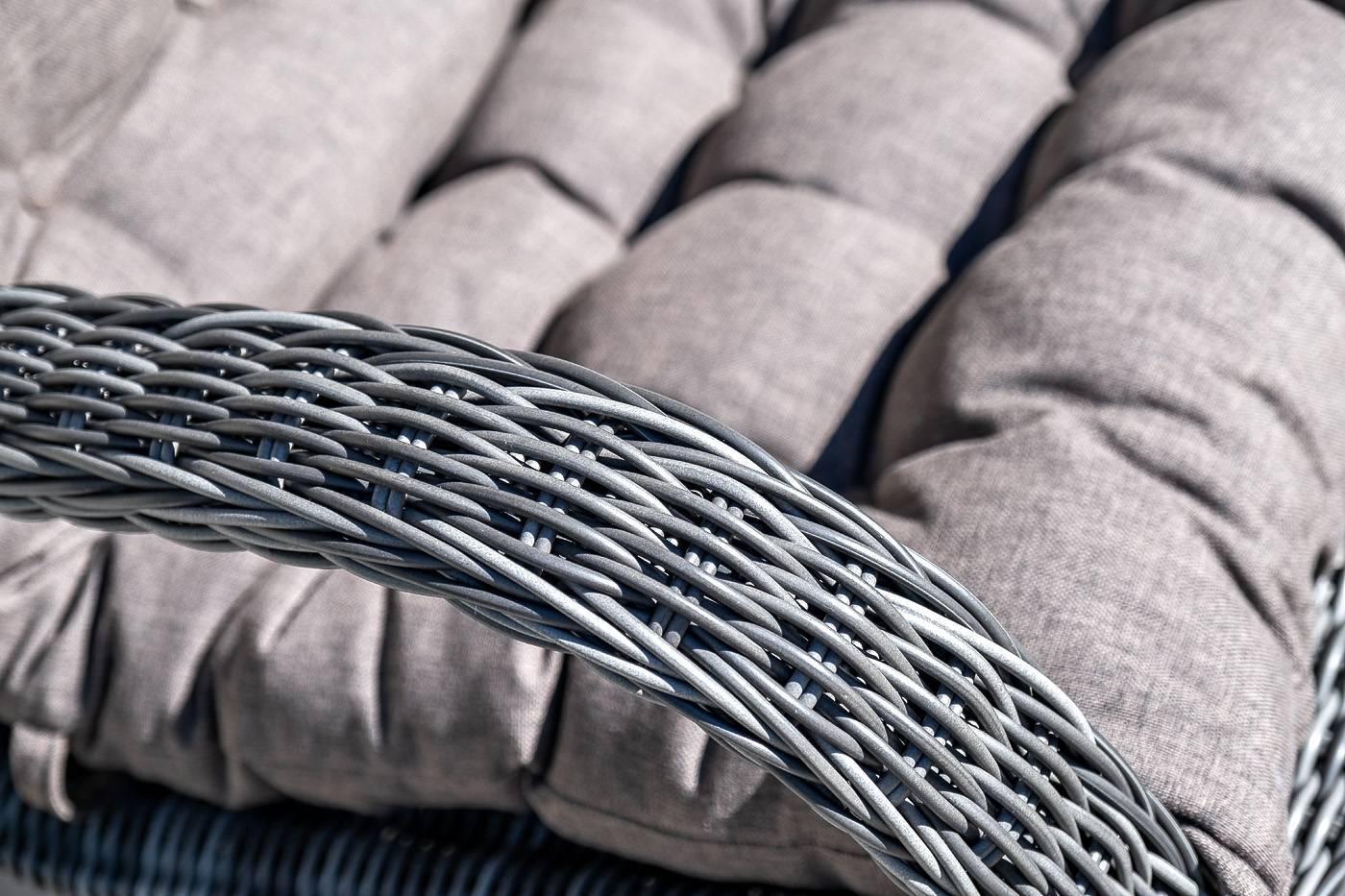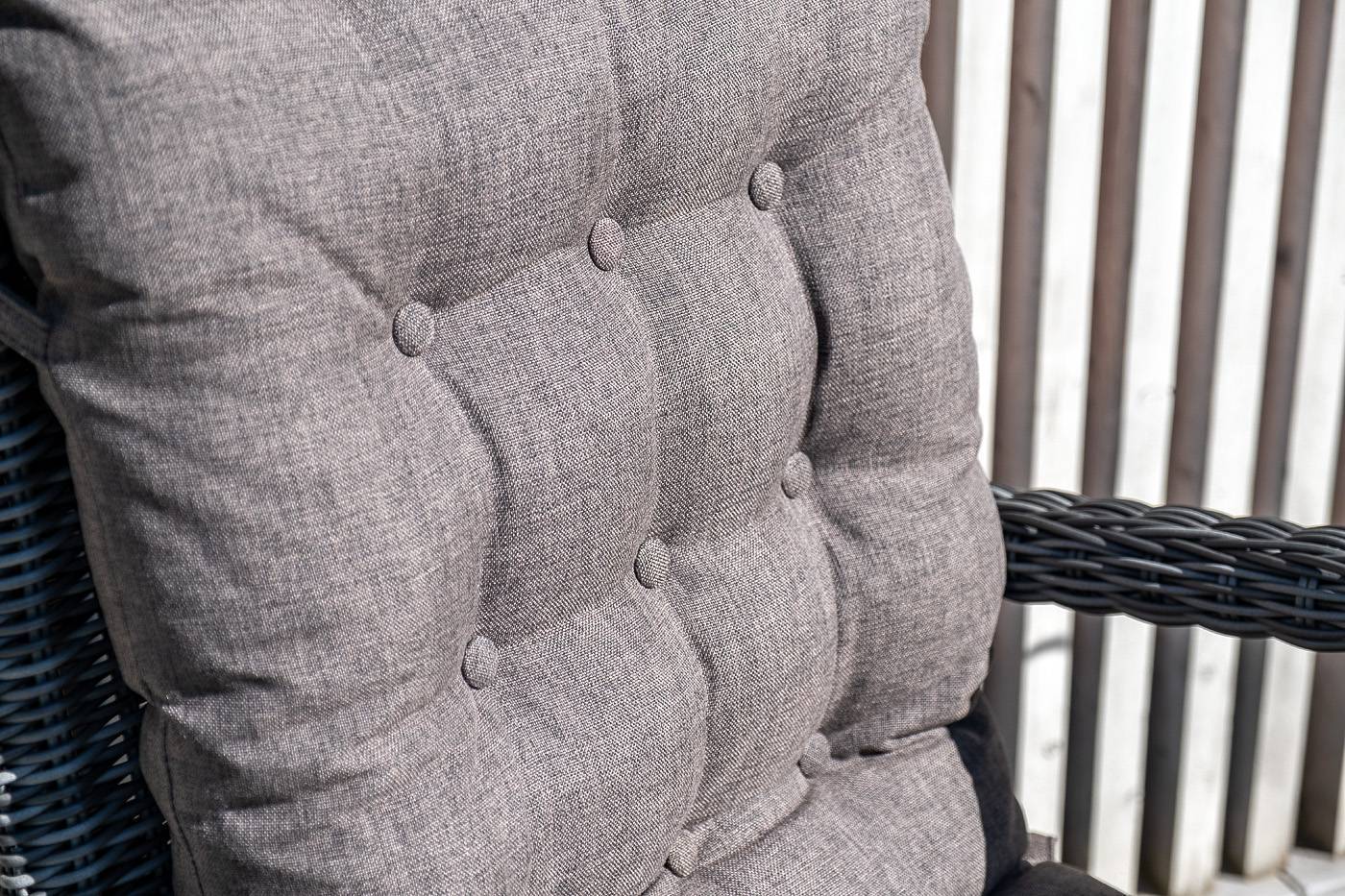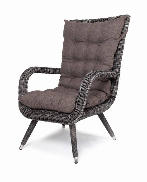 Садовое кресло дополнено мягкими подушками для комфортного размещения. Они выполнены в серо-коричневом цвете. При их пошиве используется полиэстер с плотностью 230гр/м2. Влагоотталкивающая пропитка усиливает защитные свойства материала.