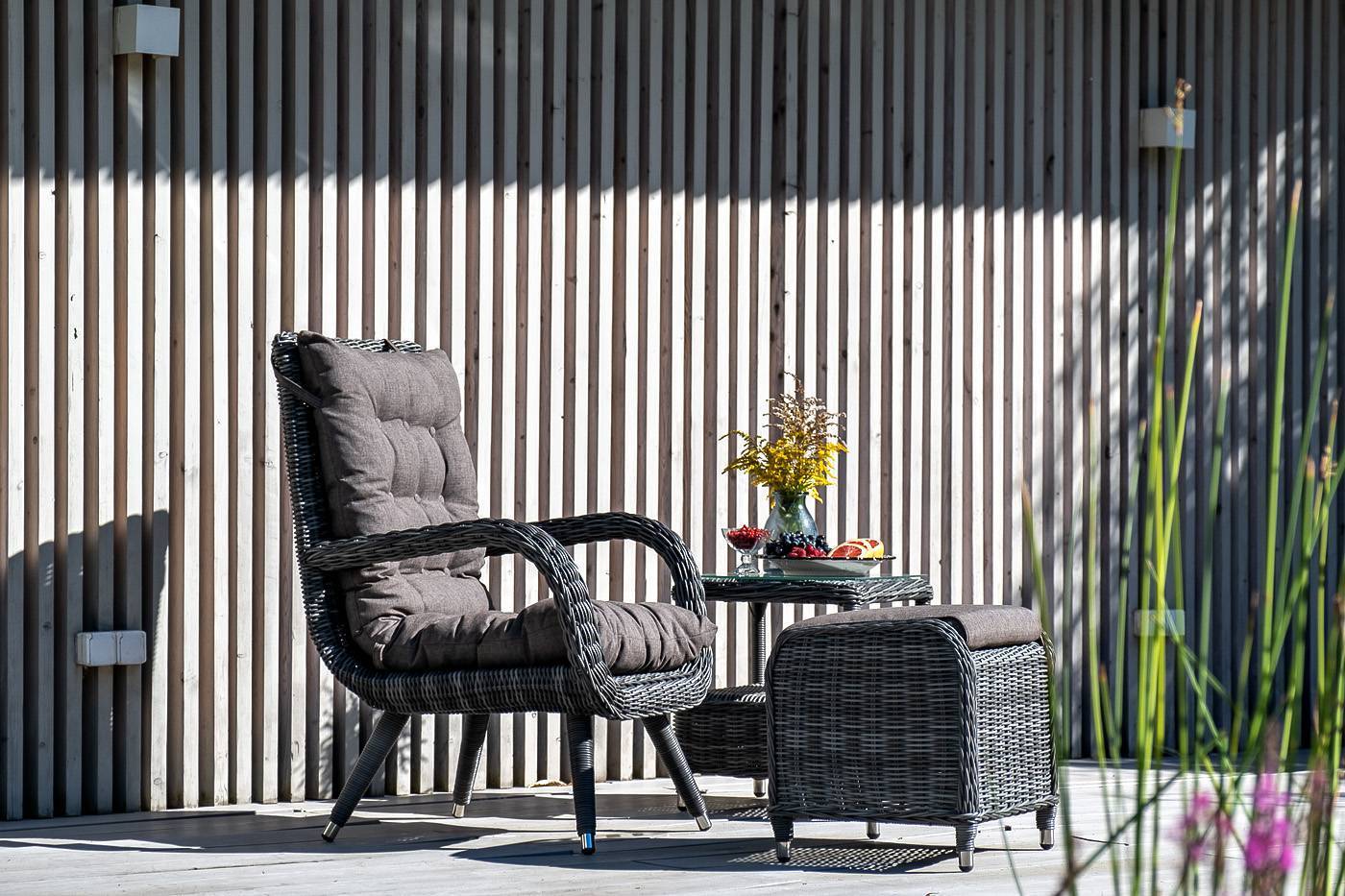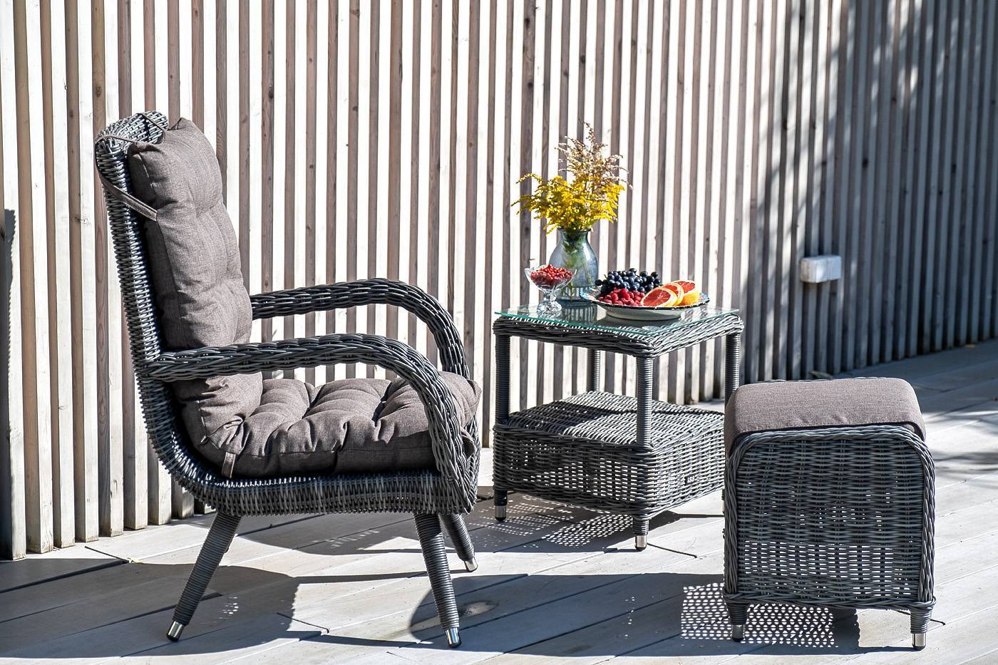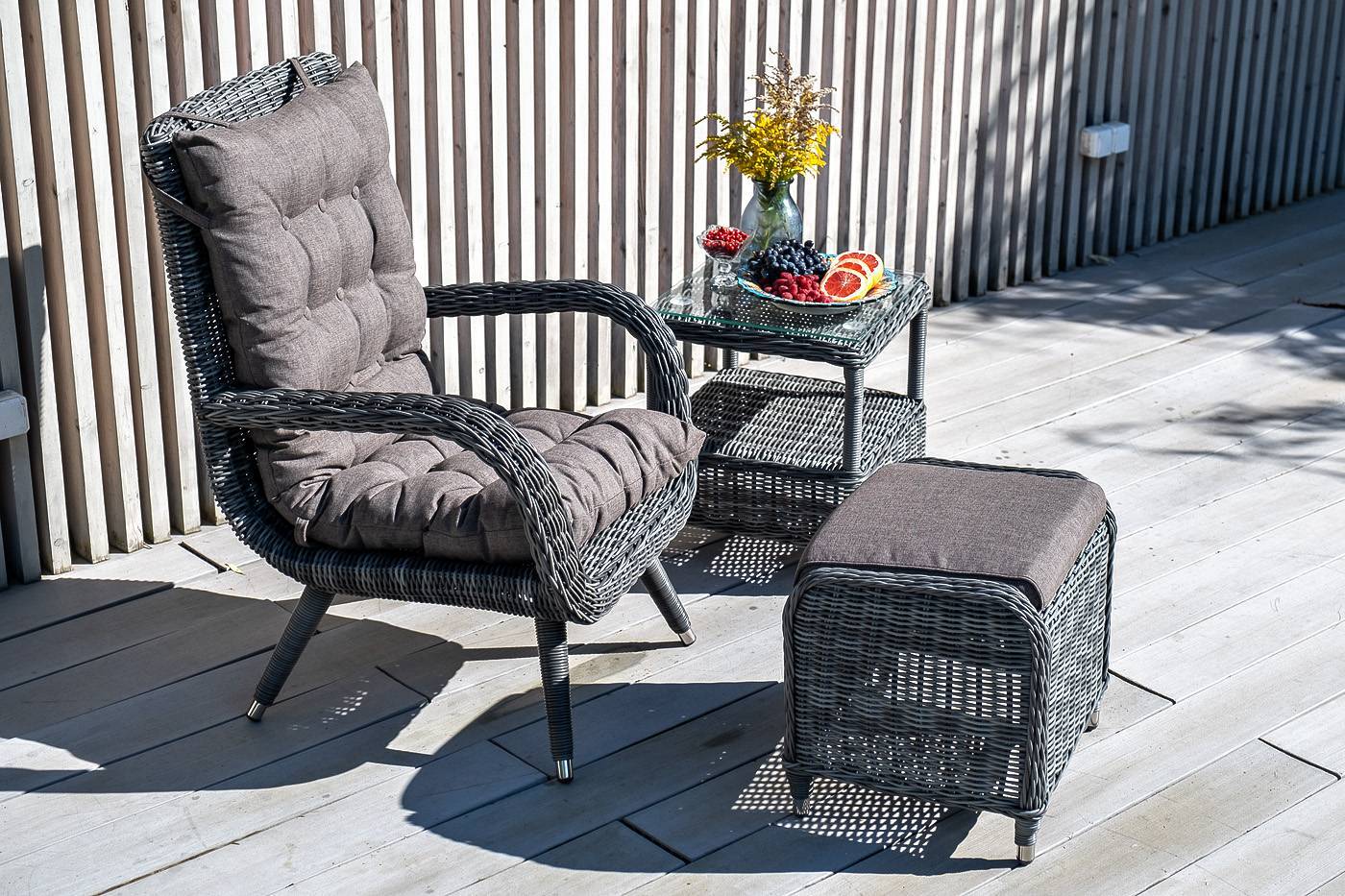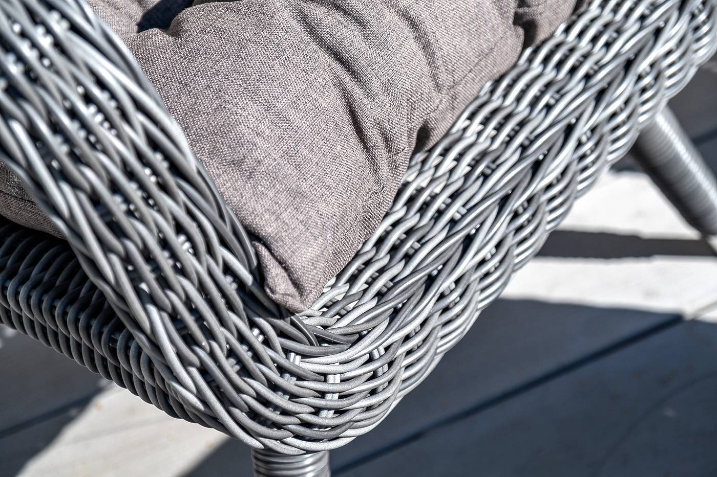 Садовое кресло дополнено мягкими подушками для комфортного размещения. Они выполнены в серо-коричневом цвете. При их пошиве используется полиэстер с плотностью 230гр/м2. Влагоотталкивающая пропитка усиливает защитные свойства материала.