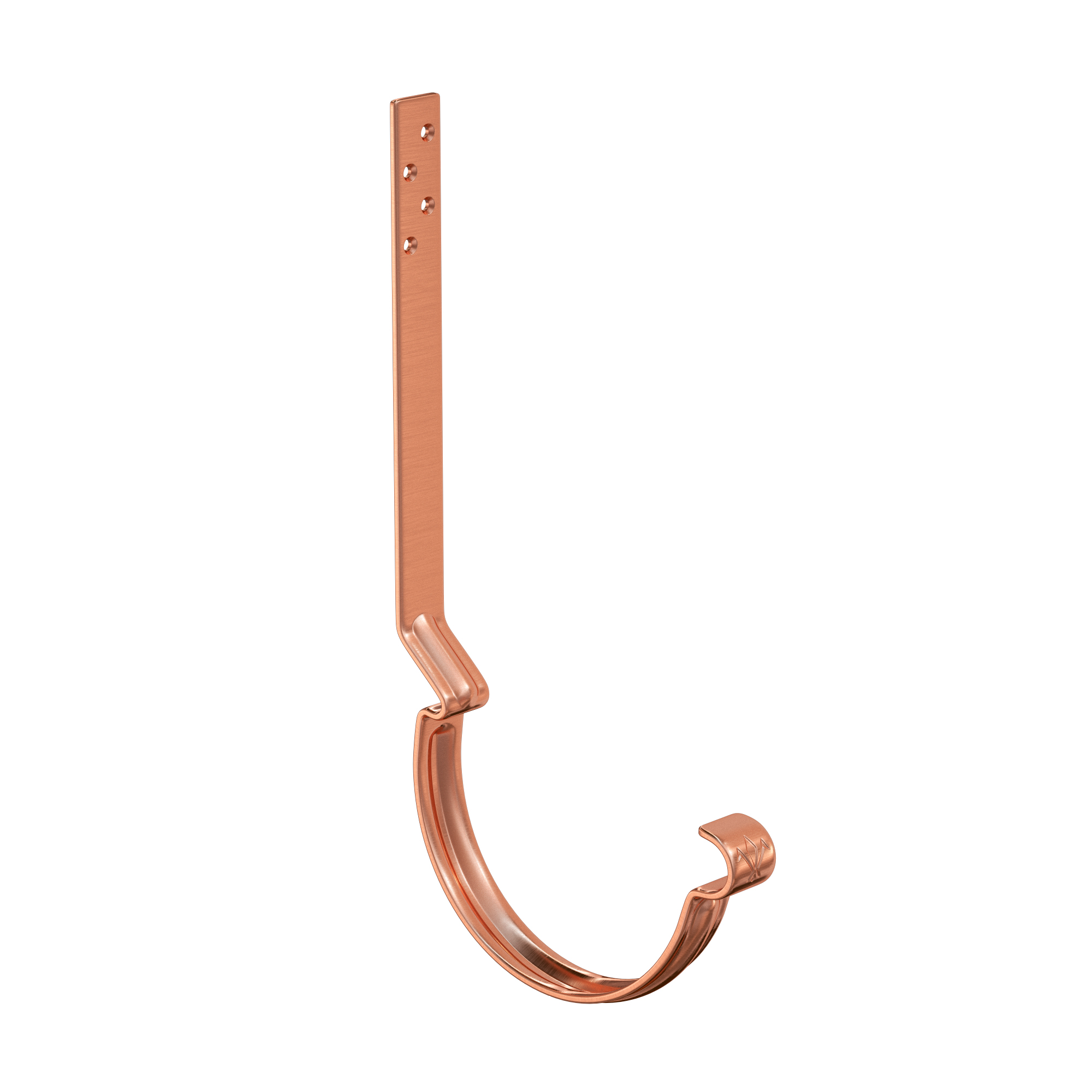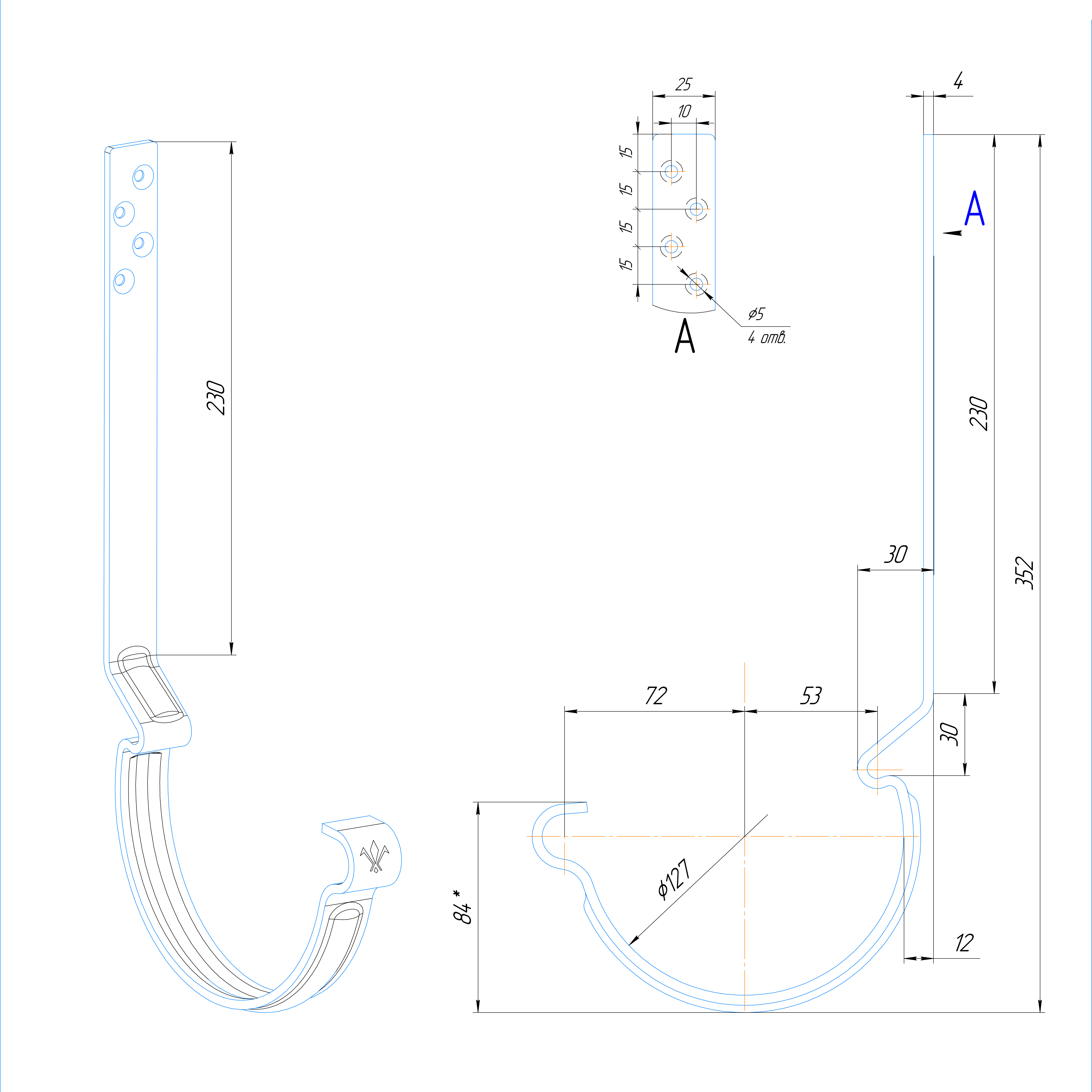 Поставляется с комплектом креплений. Конструкция крюка имеет более вытянутое и глубокое ребро жесткости, поэтому крюк выдерживает повышенные силовые нагрузки. Передний замок крюка фиксирует завиток желоба снаружи, и благодаря этому желоб удобно монтировать даже после установки фартука-капельника. Задний замок имеет конструкцию, исключающую смещение желоба под нагрузкой. Отверстия под крепеж выполнены с зенковкой под шляпку в потай. На передней части крюка расположен фирменный штамп - лилия.