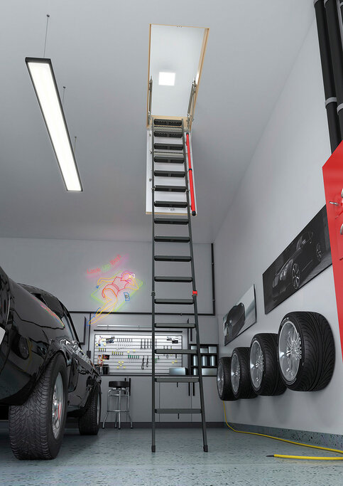 Чердачная лестница LMP предназначены для высоких потолков, высотой до 366 см. Специальные фиксаторы в местах соединения сегментов предотвращают случайное складывание лестницы. Имеет механизм плавного раскладывания, одновременно выполняющий роль поручня для комфортного подъёма.