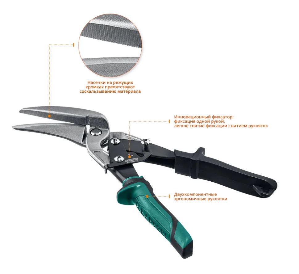 Ножницы по металлу KRAFTOOL Alligator, правые удлинённые, 280 мм 2328-RL применяются для прямой и фигурной резки (в правую сторону) листовых материалов из стали повышенной твердости, нержавеющей стали, цветных металлов. Изготовлены из хромомолибденовой стали. Индукционная закалка лезвий до твердости 62 – 65 HRC. Насечки на режущих кромках препятствуют соскальзыванию материала в процессе реза. Инновационный фиксатор: легкое снятие фиксации сжатием рукояток, фиксация одной рукой. Высокомощный двухрычажный механизм обеспечивает эффективный точный рез. Увеличенный зев облегчает рез твердой стали без заусенцев. Двухкомпонентные рукоятки обеспечивают удобство и надежный захват при работе.