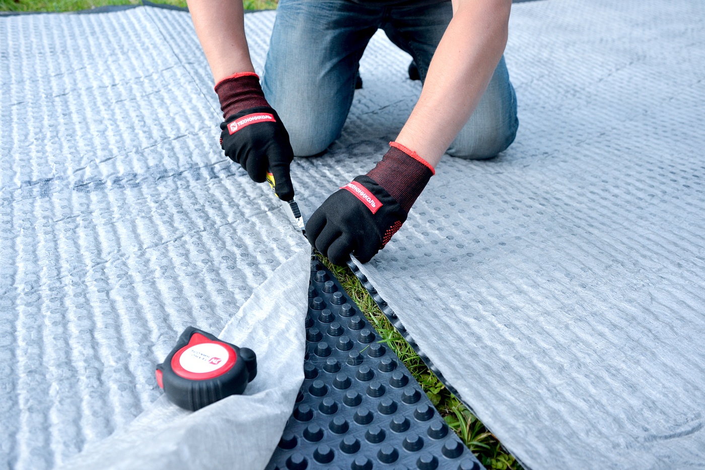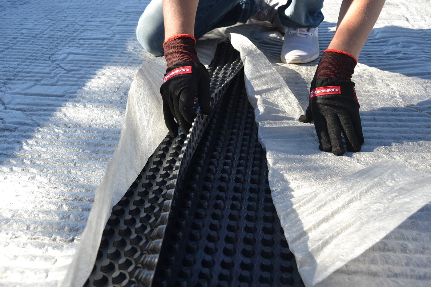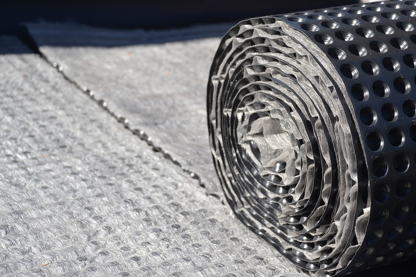 Водонепроницаемое основание из полиэтилена высокой плотности выступает в качестве защитного и дренирующего слоя. За счёт шипов в дренажной мембране образуются каналы для быстрого отведения воды.