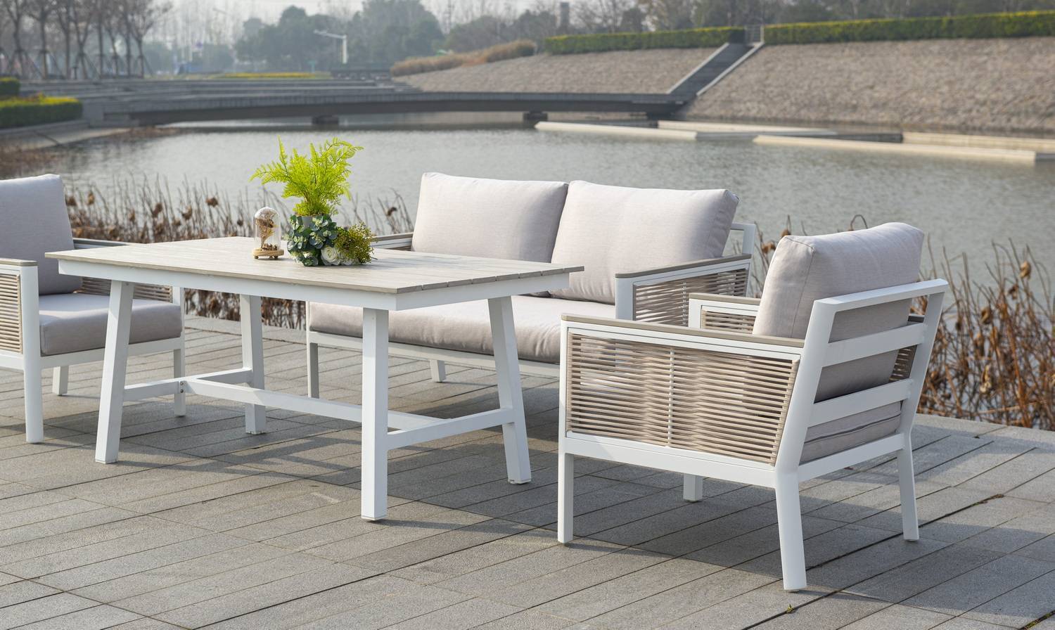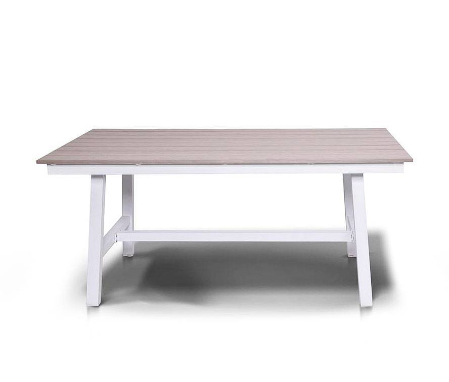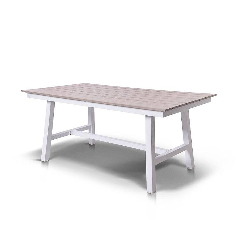 Подстолье изготовлено из легкого алюминия, окрашенного в белый цвет износостойкой порошковой краской, столешница – из композитного материала ДПК бежевого цвета.