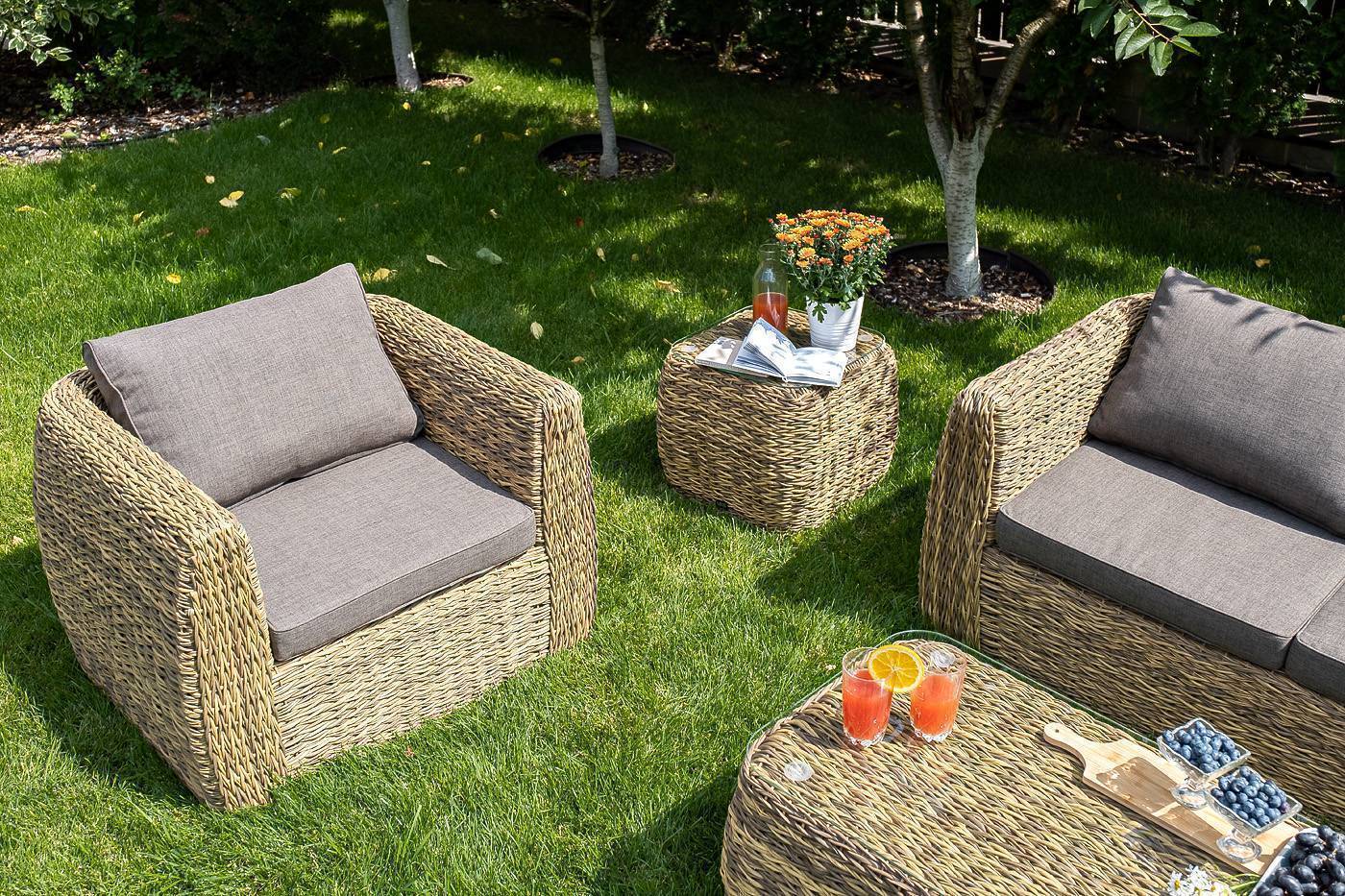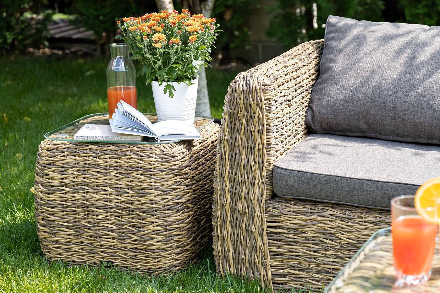 «Кальяри» кофейный столик, алюминиевый каркас, искусственный ротанг вида "гиацинт", ручное плетение, столешница из закаленного стекла толщиной 5 мм, размер: 540×540×430 мм, цвет соломенный, вес: 7,5 кг.