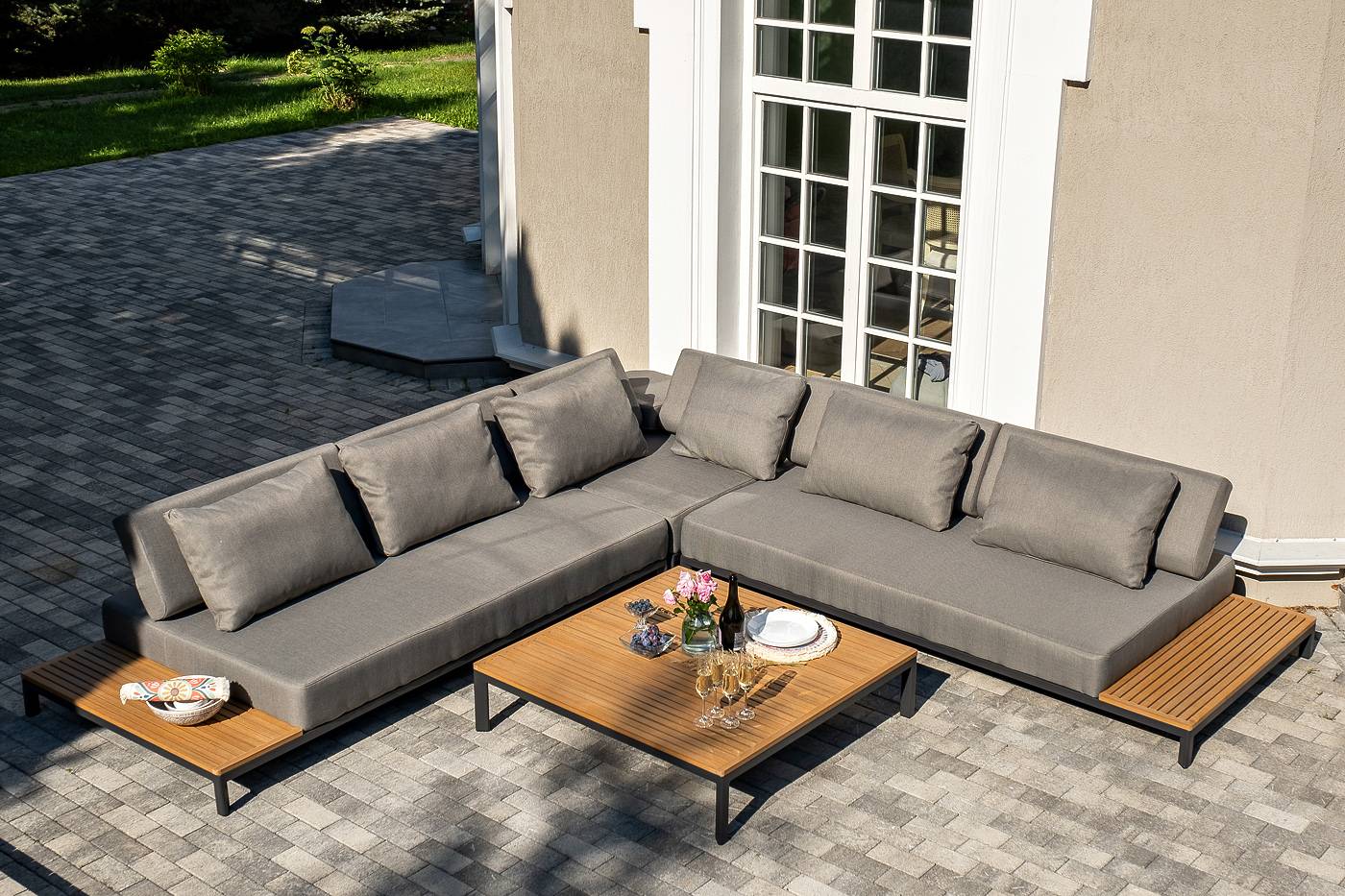 В основе находится алюминиевый каркас, который выступает в качестве устойчивой опоры. Столешница - тик. Мебель представлена в графитовом цвете.
