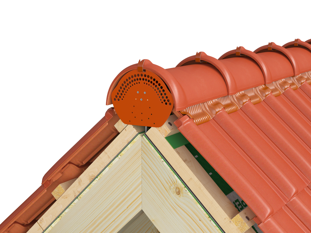 Вентиляционное завершение конька Eurovent® DECK. Елемент исползуемый в качестве завершения хребта. Изготовлен из пластмасса, имеет специальные равномерно расположенные вентиляционные отверстия, которые обеспечивают эффективную циркуляцию воздуха со стороны конька.